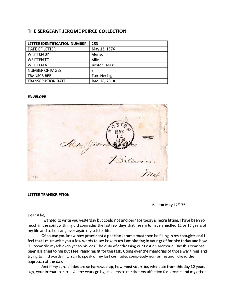 Primarily letters written during the American Civil War by Jerome Peirce, 36th Regiment of Massachusetts Volunteers, to his wife from late 1862 until May 1864, when he was killed in action. Also includes a few letters from Peirce's wife and other correspondence to and from other Peirce family members and friends.