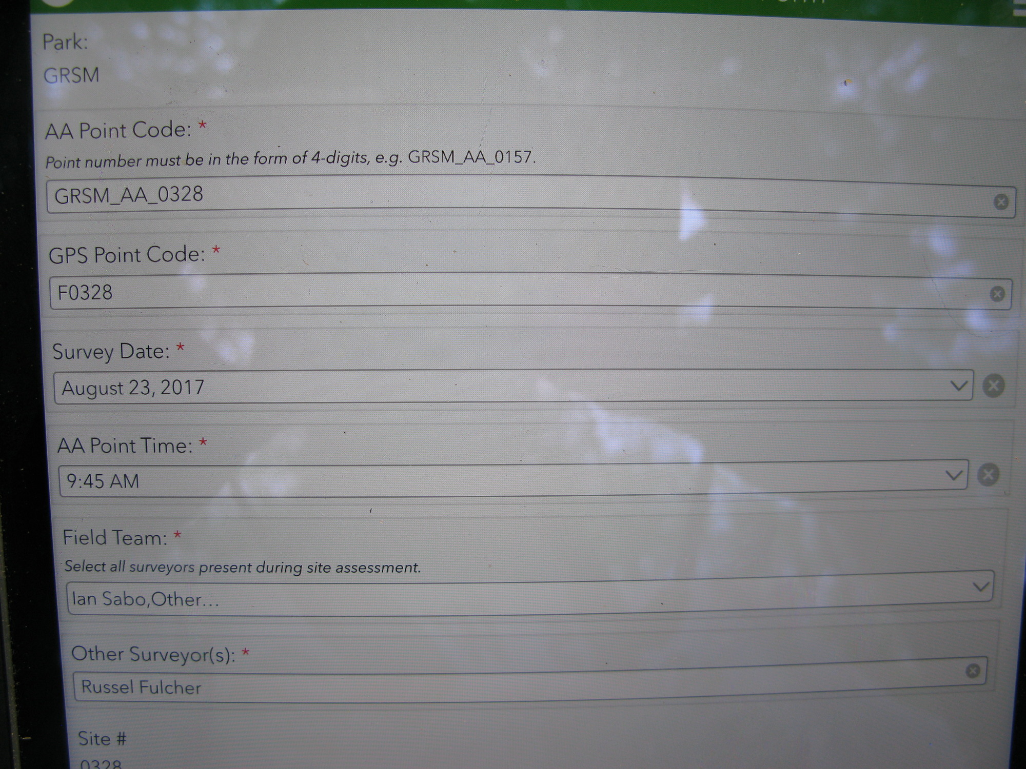 Plot Code: GRSM_AA_0328_1 from the Great Smoky Mountains National Park (GRSM) Accuracy Assessment.