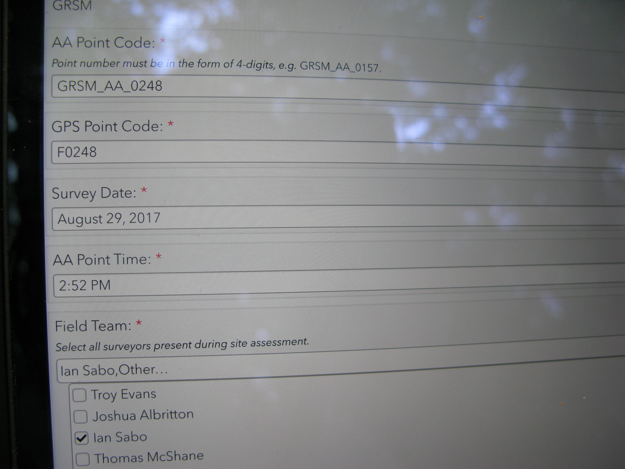 Plot Code: GRSM_AA_0248_1 from the Great Smoky Mountains National Park (GRSM) Accuracy Assessment.