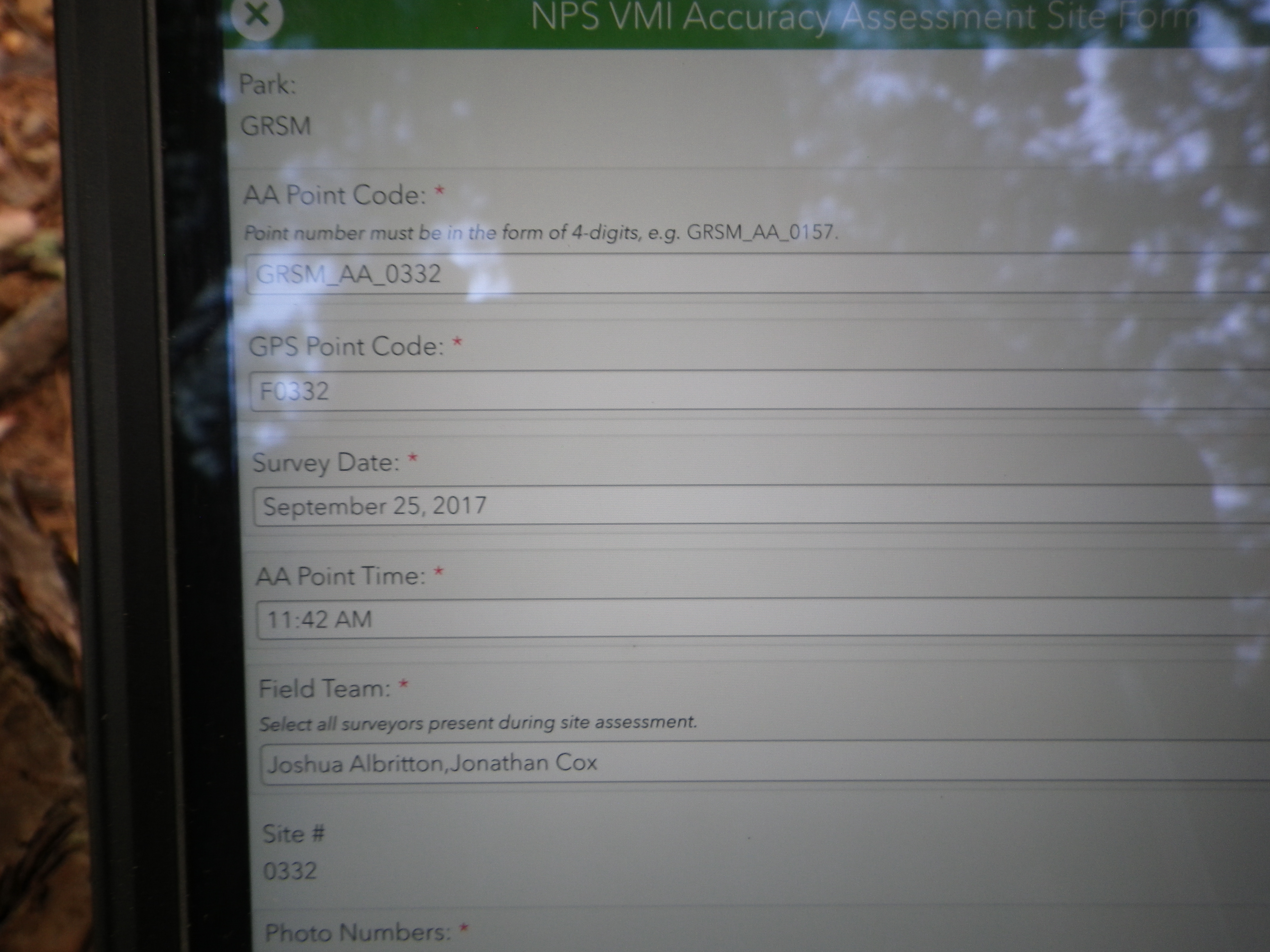 Plot Code: GRSM_AA_0332_1 from the Great Smoky Mountains National Park (GRSM) Accuracy Assessment.
