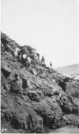 The image is in black and white. A large group of hikers in the upper left and center of the image make their way down the bluff, a steeply sloped, loose-rock incline. Huge boulders litter the area around the path, and stones jut out from the hill. The camera is far from the hikers, who are in the back of the middle ground of the image. Lava fields are faintly visible behind the incline. The sky is clear.