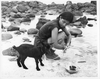 A black and white image of a young girl squatting down next to a dark colored baby goat. The girl is located in the center of the image. She is wearing a t-shirt, shorts, and sneakers squatting down in a sandy area. She is holding onto the end of a leash looking down at the goat. The baby goat is standing to the left of her facing the right side of the image. It has a collar around its neck with the leash attached. In front of the goat are two bowls and a eating untencil stacked on the ground. In the background there is a pile of lava rocks.