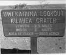 A black and white image of a wooden trailhead sign.The sign reads, "UWEKAHUNA LOOKOUT KILAUEA CRATER LENGTH 2.5 MILES WIDTH 2 MILES AREA OF FLOOR - 2600 ACRES." Behind the sign is a gravel filled landscape with a couple of trees.