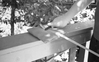 A black and white image demonstrating a step in a craft making process. In the center of the image there is a small thin bundle of fabric resting on top of a wooden railing. On top of the fabric bundle there is a long leaf extending out towards the left bottom corner of the image. A person is standing behind the leaf holding a knife or another tool across the width of the leaf. It appears the tool is being used to smooth out the leaf or sand it down. Only the person's hand, forearm, and a small part of their shirt and pants are visible in the image.