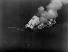Black and white photograph of large plumes of smoke taken from a bird’s-eye view. The photograph is dark, and only the smoke and some buildings are visible. The white smoke cloud begins at the center of the photograph and extends beyond the top right corner. To the left of this, A small group of buildings can be seen on the ground. The rest of the photograph is almost completely black. A handwritten number “13” is present in the bottom left corner.