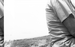 A black and white image of a flat lava field with patches of grass growing up through the cracks in the lava. On the right side of the image there is a person standing with the side of their body facing the camera. Only the person's arm, shoulder, and a portion of their back is visible.