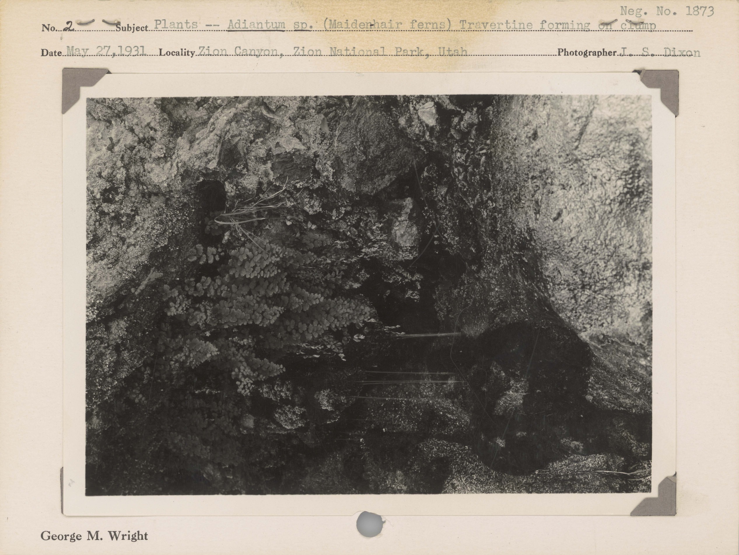 Plants--Adiantum sp. (Maidenhair ferns) Travertine forming on clump. Locality: Zion Canyon, Zion National Park, Utah. Negative #: 1873