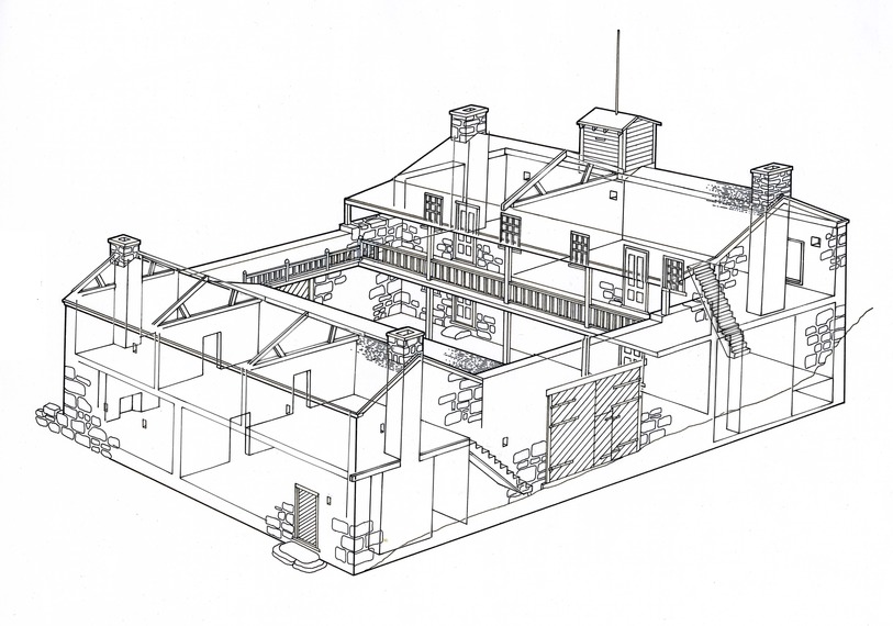 Published in the park's 2-color unigrid brochure illustration consists of two parts: base illustration on paper of the exterior and courtyard of the structure and an interior schematic overlay on frosted Mylar showing the rooms, trusses, stairways, and fireplaces registered to the fort diagram.; Abbr=PUB