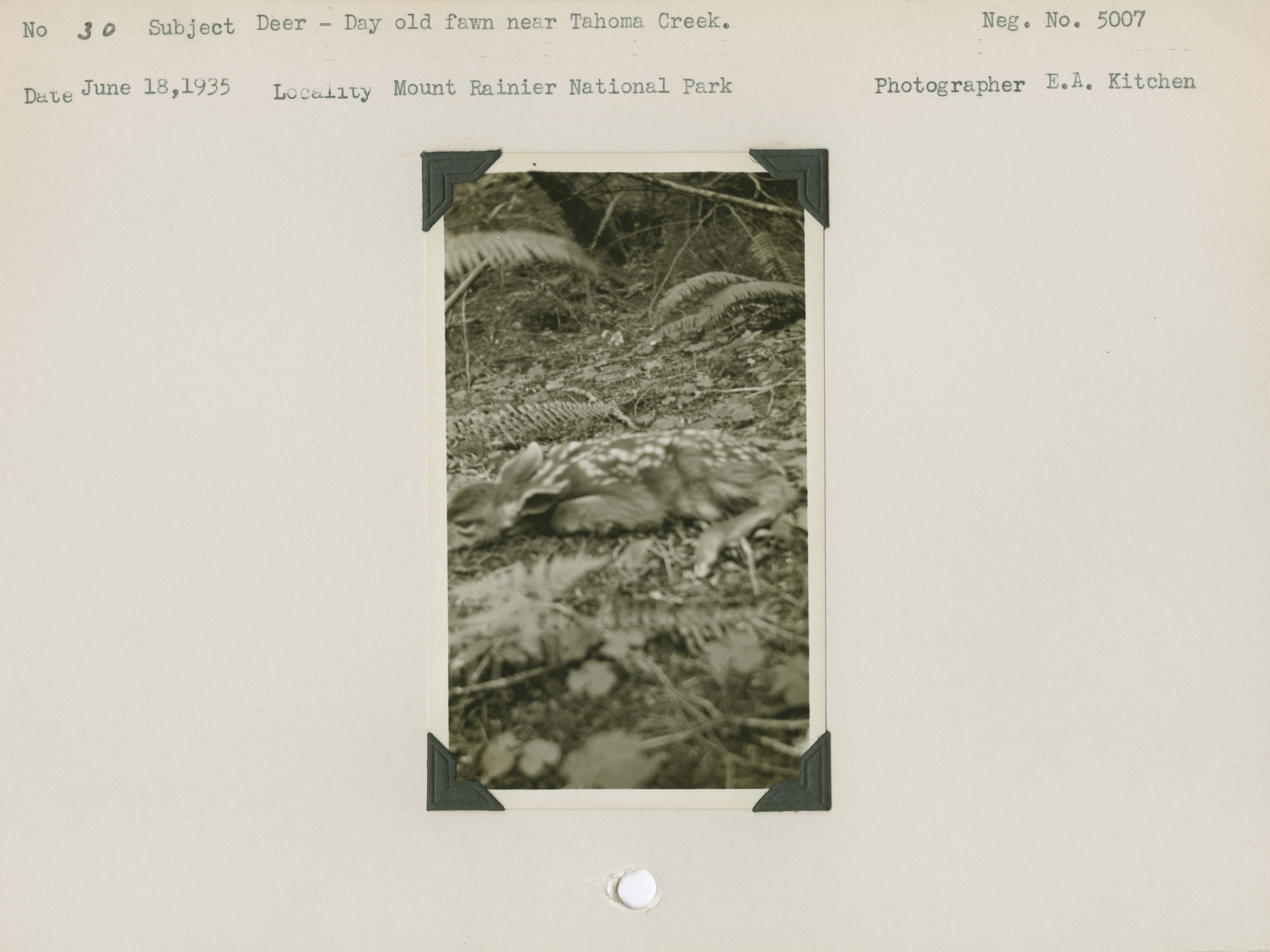 Deer – Day old fawn near Tahoma Creek. Locality: Mount Rainier National Park. Negative: 5007.