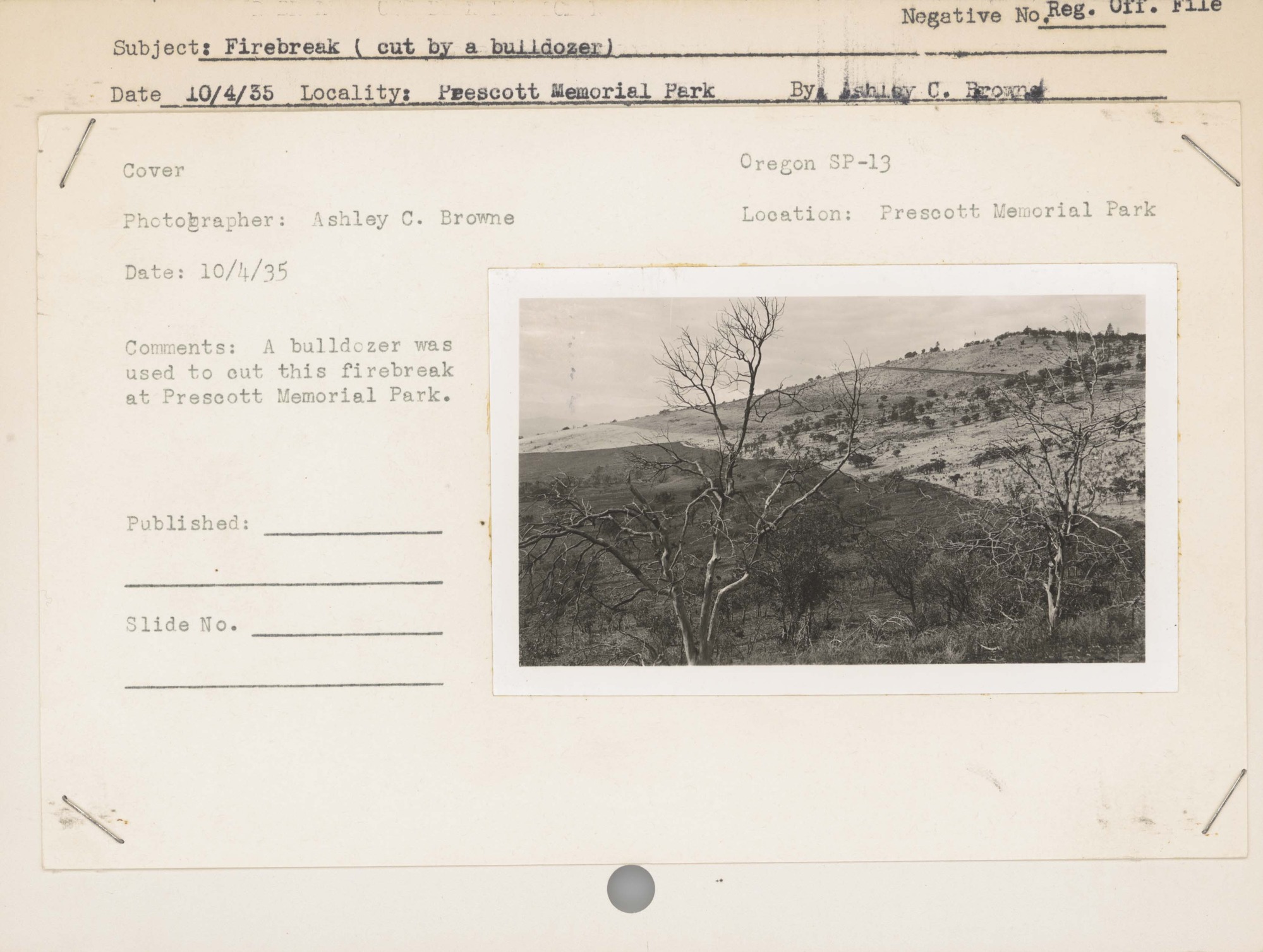 Firebreak (cut by a bulldozer). Locality: Prescott Memorial Park. No Negative on File. Comments: A bulldozer was used to cut this firebreak at Prescott Memorial Park.