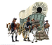 Continental soldiers unloading military provisions from a Conestoga wagon.