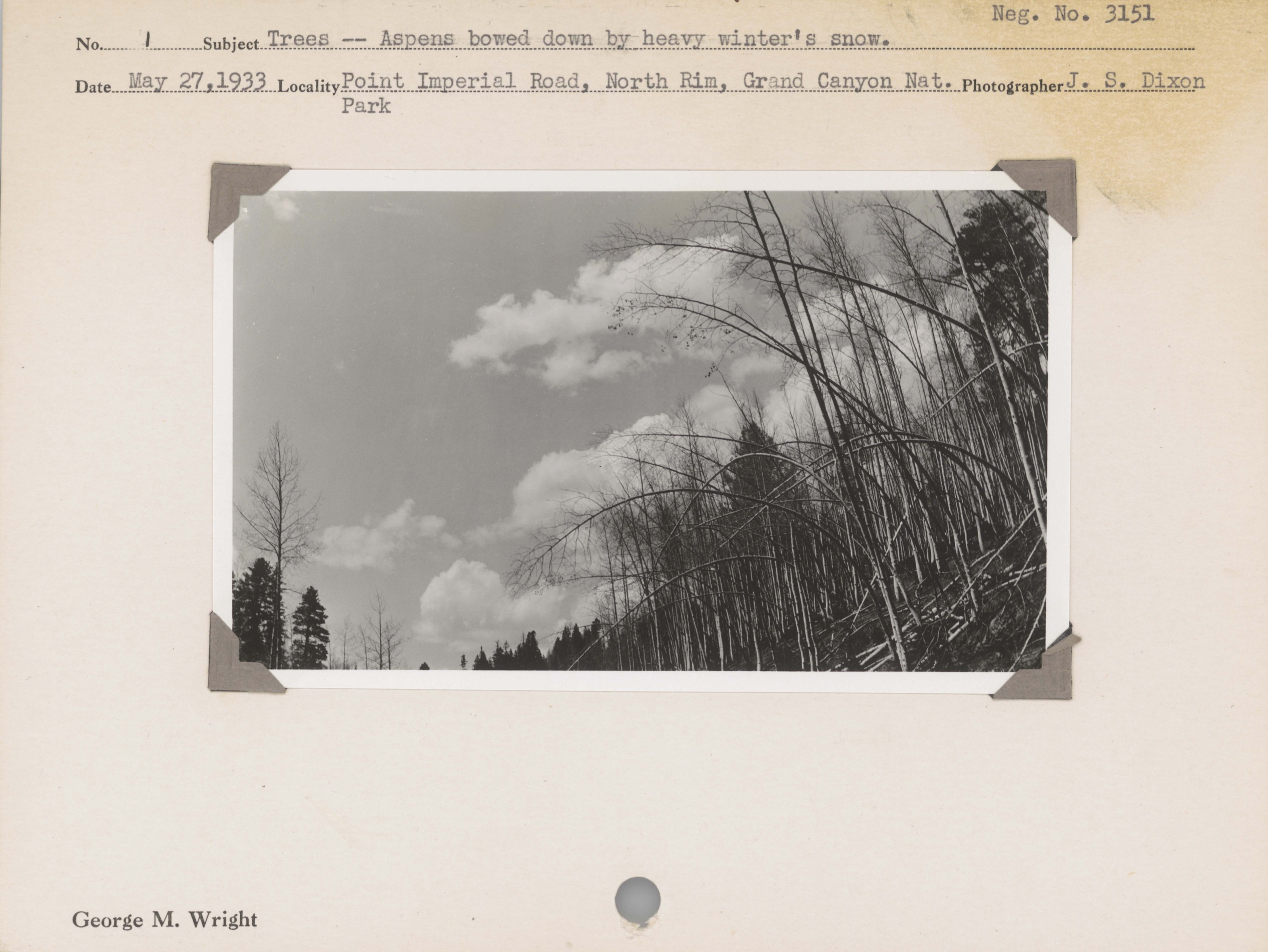 Trees – Aspen bowed down by heavy winter’s snow. Negative #: 3151. Locality: Point Imperial Road, North Rim, Grand Canyon National Park.