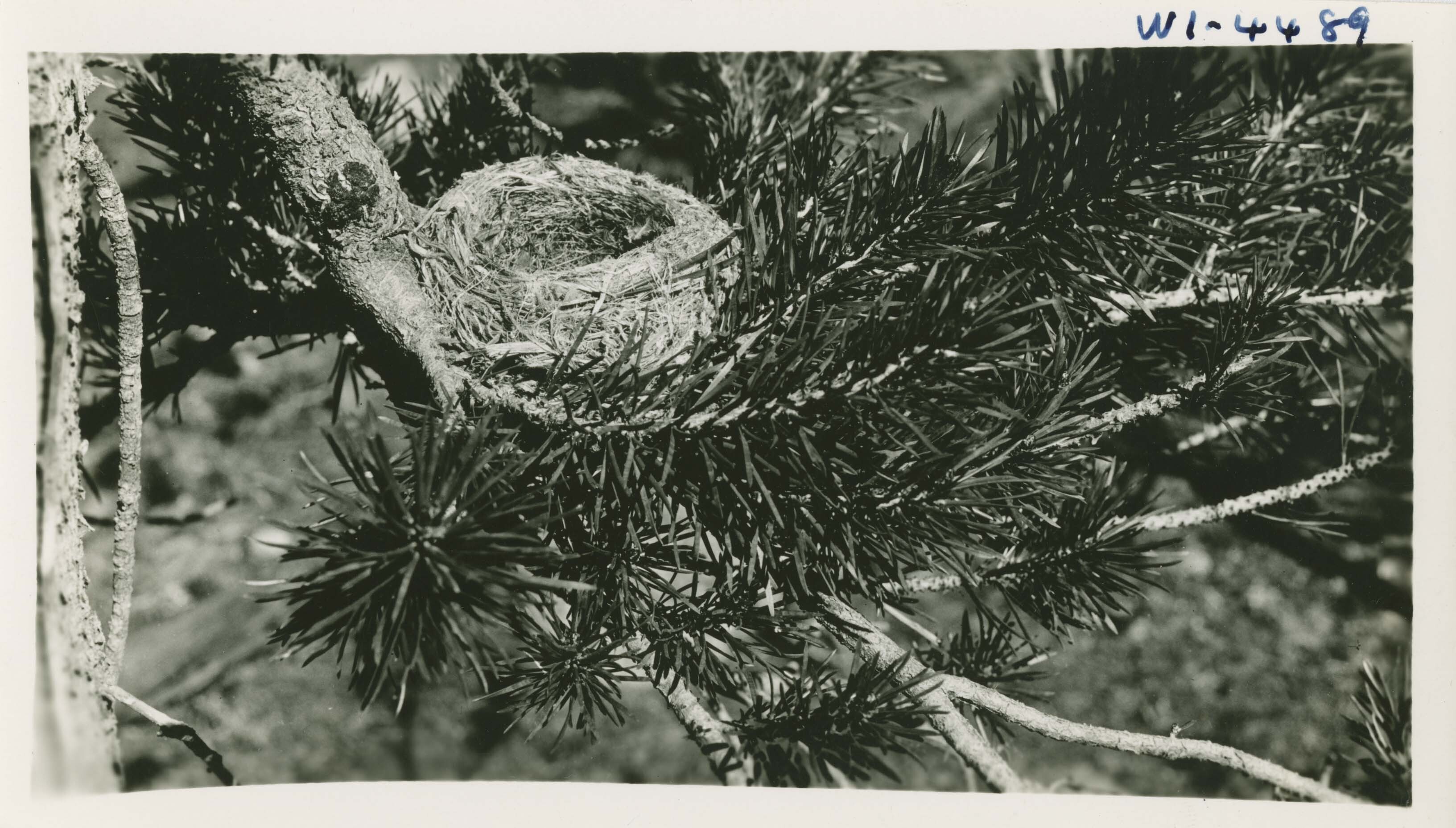 Birds: Flycatcher, Wright's. Close-up of nest in lodgepole pine. Locality: Horse Creek, Sequoia National Park. Negative #: 4489