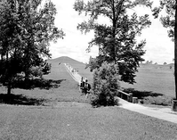 Restored earth lodge from east showing visitors on footbridge and walk to earth lodge. (Reconstruction from archeological evidence, not a restoration). Ocmulgee Mounds National Historical Park (formerly Ocmulgee National Monument).