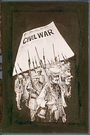 Newspaper announcing Civil War with troops underneath.