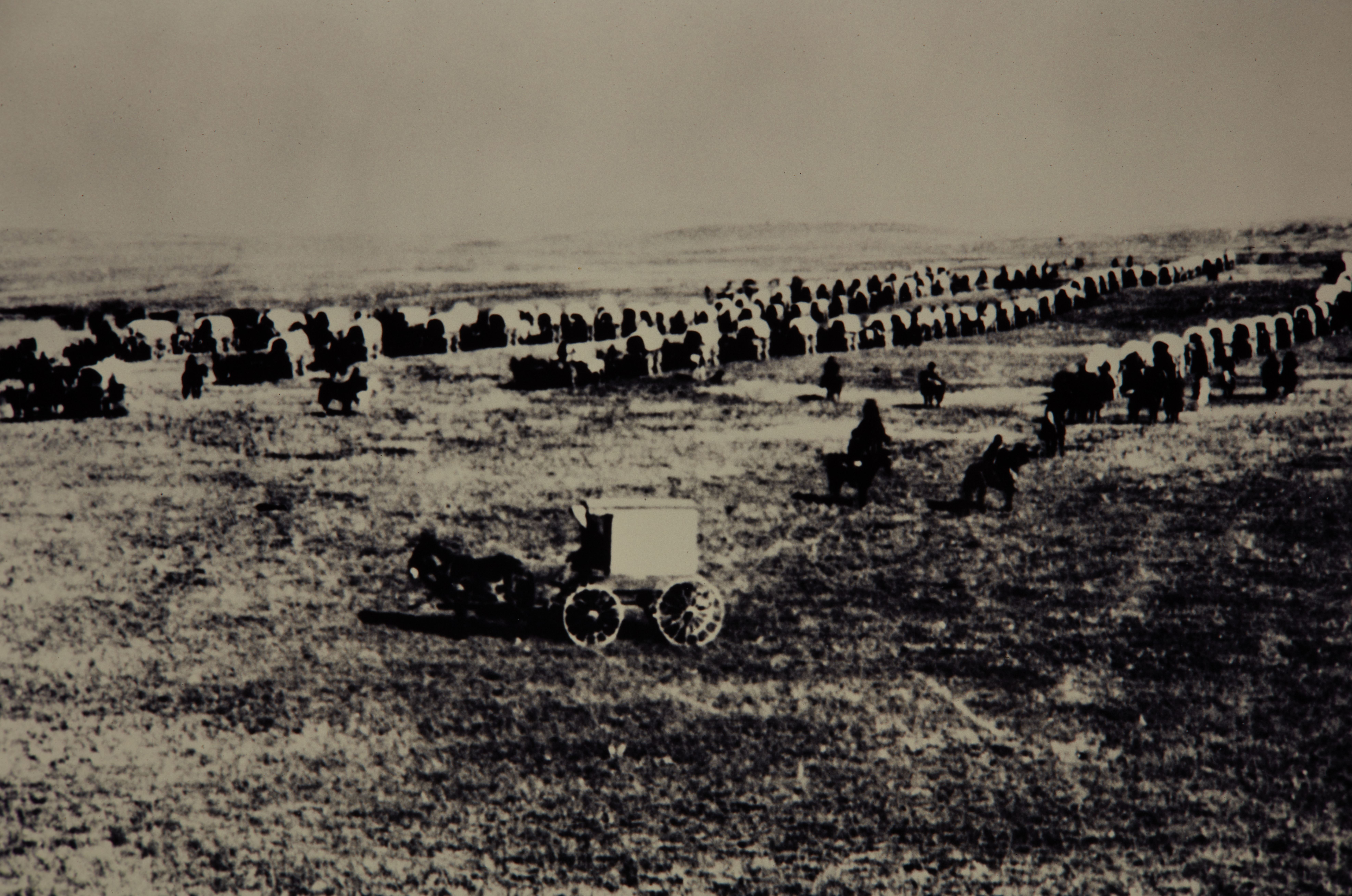 Visitors pulling stagecoaches in Little Bighorn Battlefield National Monument.