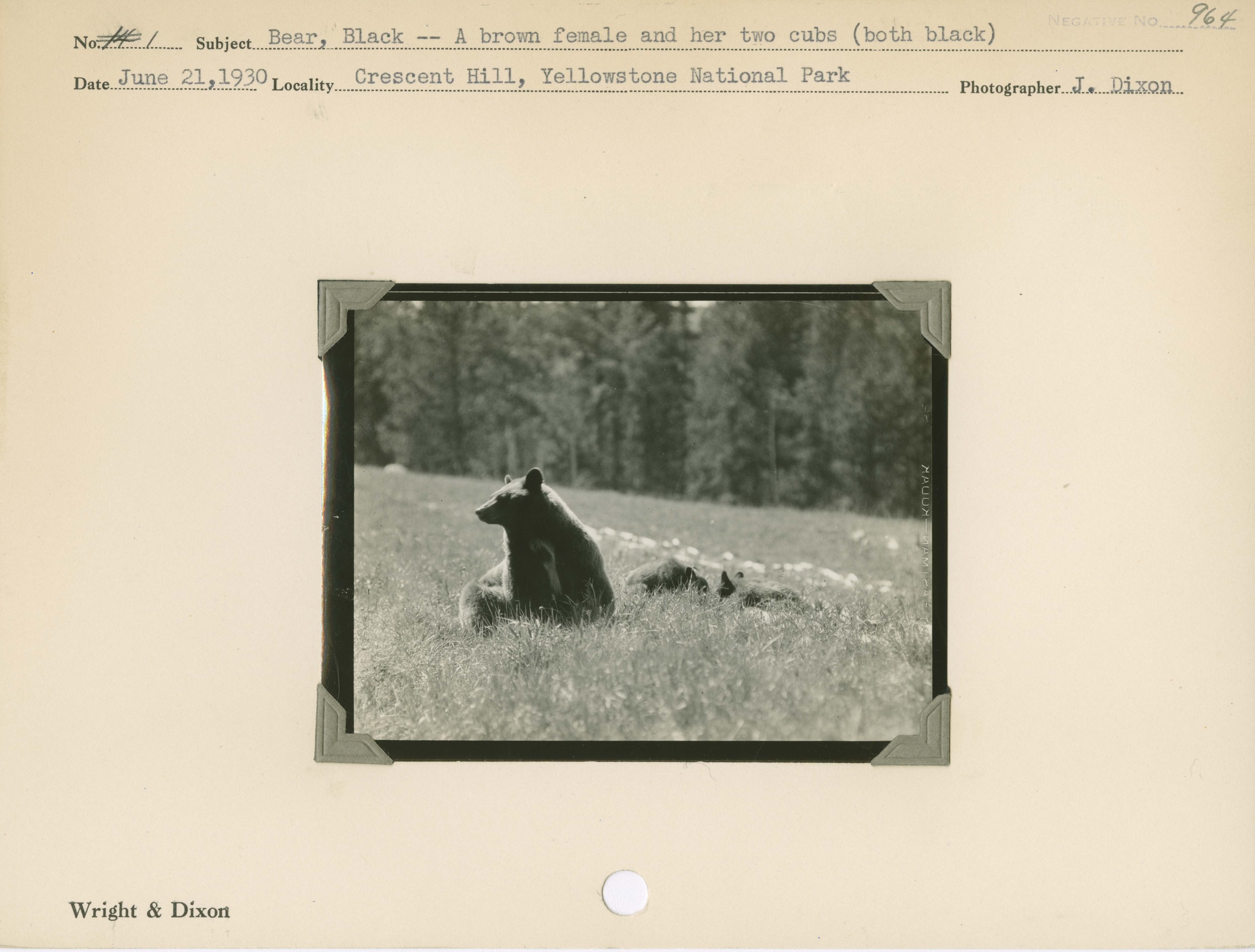 Bear, Black – A brown female and her two cubs (both black). Locality: Crescent Hill, Yellowstone National Park. Negative #: 964