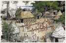 Croix Island, c1350. Unearthed in 1923, this is the only such ball court known in the Lesser Antilles. The scene shows a game in progress located within the living core of the Taino village with spectators in the vicinity of the ball court. Petroglyphs, upright stones carved with symbols, line the playing field. Participants in the game are male with the chief, shaman, and other dignitaries sitting at the head of the court (at right). The chief and shaman are seated on their low, four-footed, wood or stone ceremonial seats. Opposing teams try to move a large rubber ball through the air to the other goal, using only their heads, shoulders, arms and hips, but not their feet or hands. In the background at left, two Taino women squeeze grated cassava from a hanging, woven tube of basketry, to leach out the poison before making flour for bread.