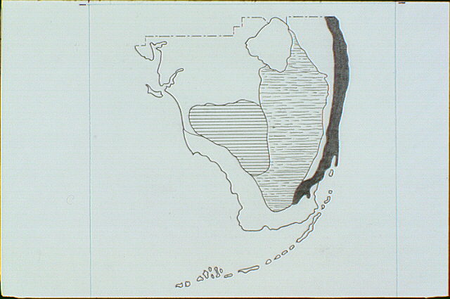 Partial map of Florida highlighting Lake Okeechobee, Big Cypress Swamp (horizontal lines), Everglades (broken horizontal lines), Coastal Prairie, Mangrove Swamp, and Pine Rockland.