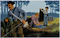 Confederate troops folding up sleeping blankets and breaking camp.
