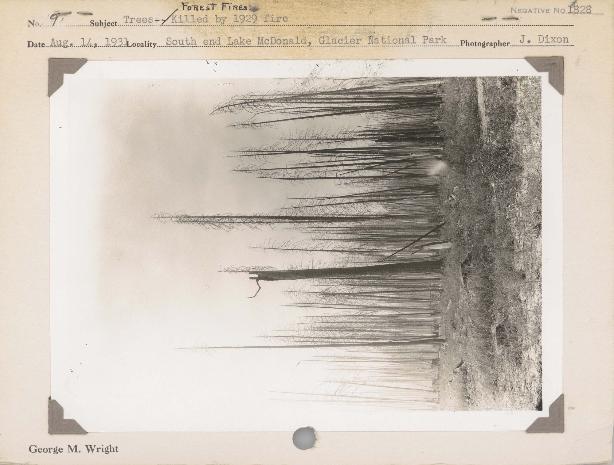 Trees – Forest Fires: Killed by 1929 fire. Negative #: 1828. Locality: South end Lake McDonald, Glacier National Park.