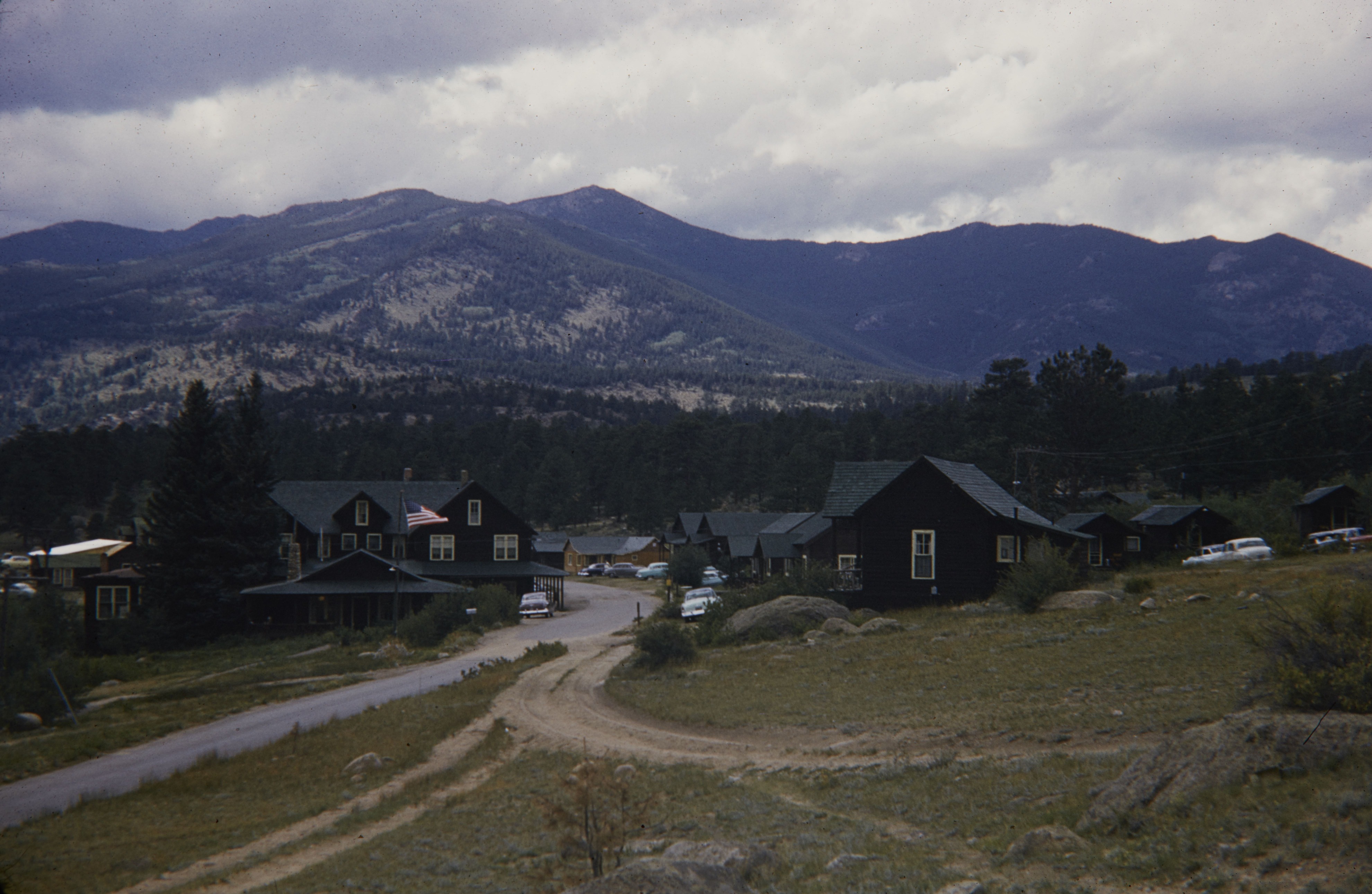 Buildings with cars parked outside with mountains in the background at Mount Rainier National Park.