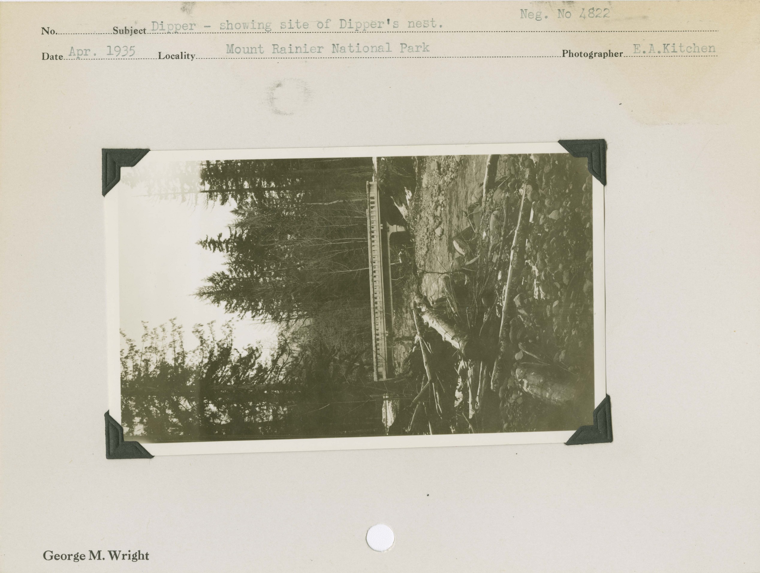 Dipper -- showing site of Dipper's nest. Locality: Mount Rainier National Park. Negative #: 4822
