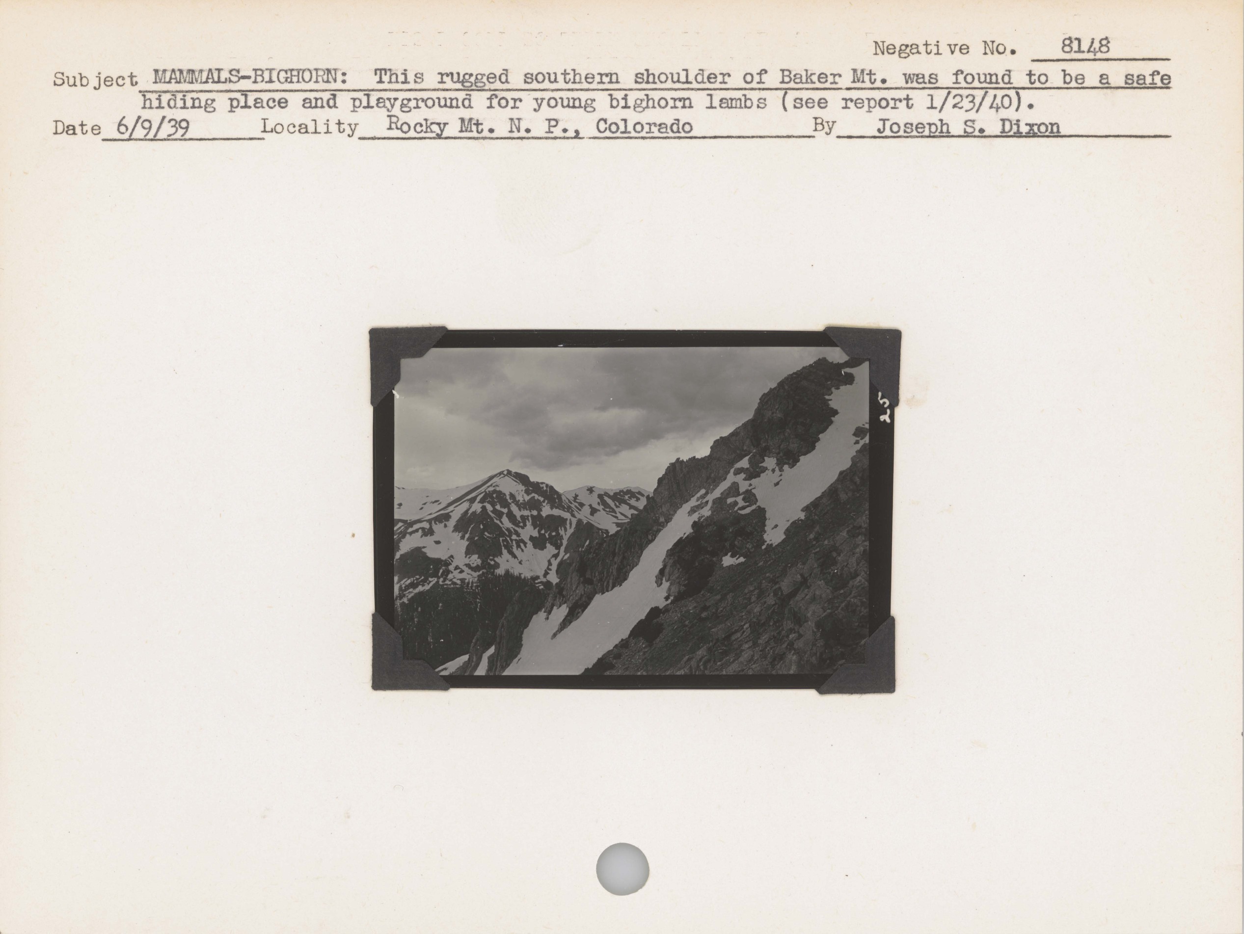 Mammals--Bighorn--This rugged southern shoulder of Baker Mountain was found to be a safe hiding place and playground for young bighorn lambs (see report 1/23/1940). Locality: Rocky Mountain National Park, Colorado. Negative #: 8148