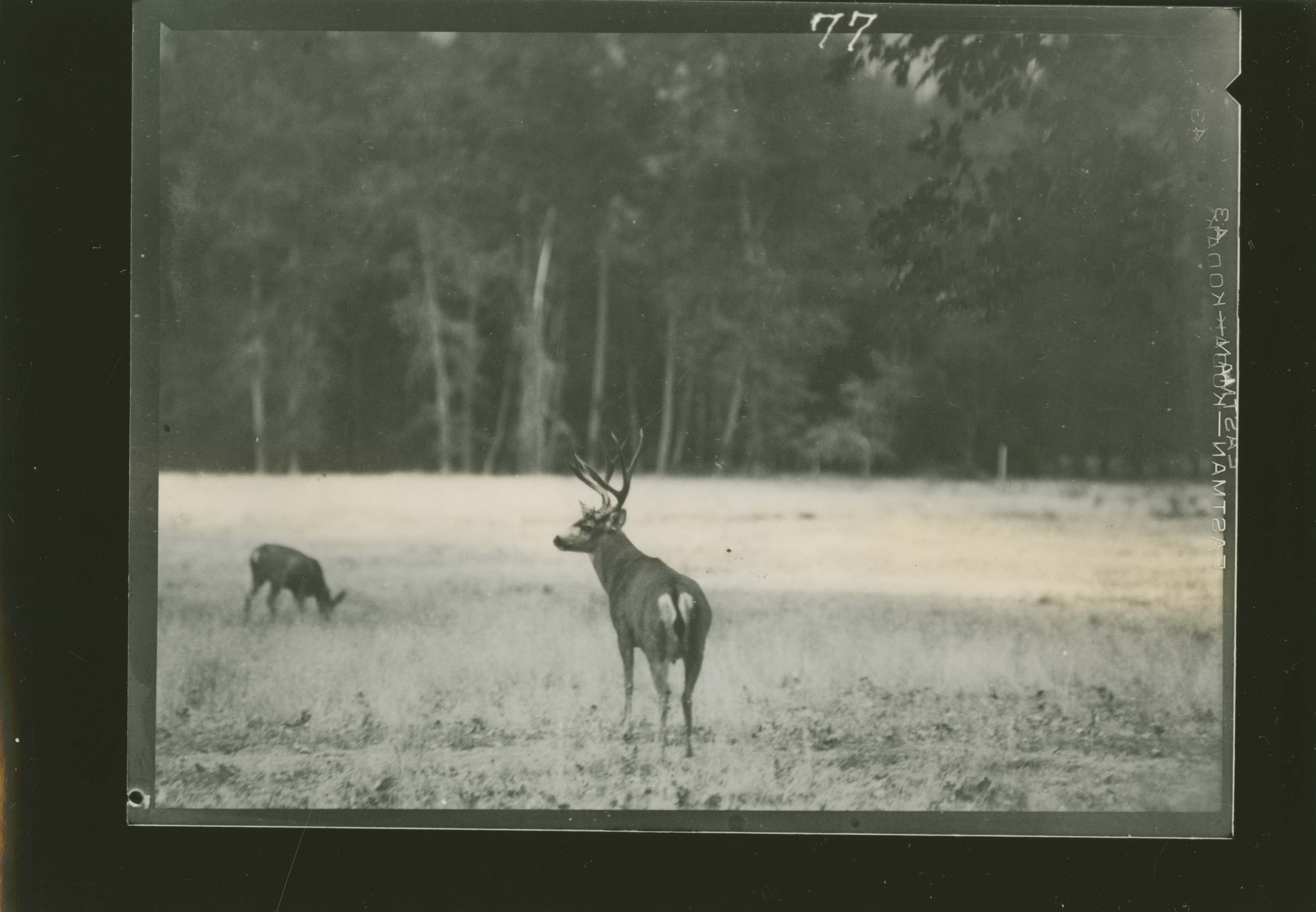 California Mule Deer. Meadow buck (head up). Locality: Yosemite National Park. Negative #: 77. Location of Negative: Region Four Headquarters. [This information comes from the reverse of the envelope for this negative number.].