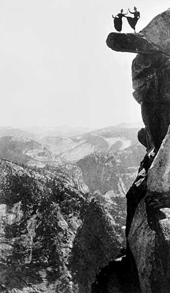 Kitty Tatch and friend on overhanging rock, Yosemite National Park. Credit Yosemite National Park Research Library (neg # YM-5252).