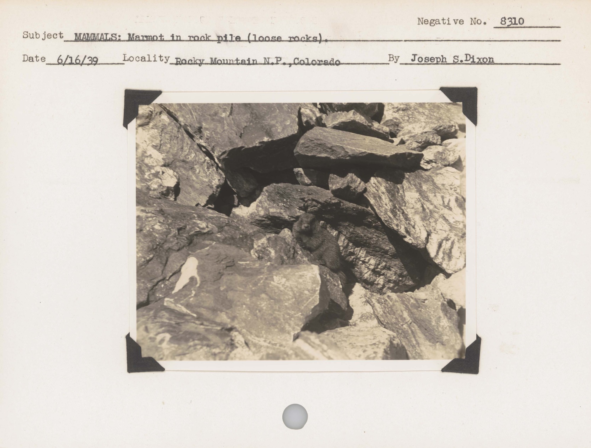 Mammals: Marmot, in rock pile (loose rocks). Negative #: 8310. Locality: Rocky Mountain National Park, Colorado.