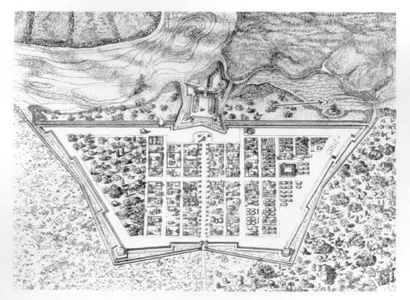 Sketch of Fort Frederica, c1740: orientation and reconstruction of the town as viewed from the visitor's approach.
