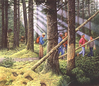 Alaska Brown bears half hidden in dense woods along Brooks Falls Trail. Hikers, visitors, and photographers are depicted on the trail. Tree in foreground shows signs of bear claw marks.