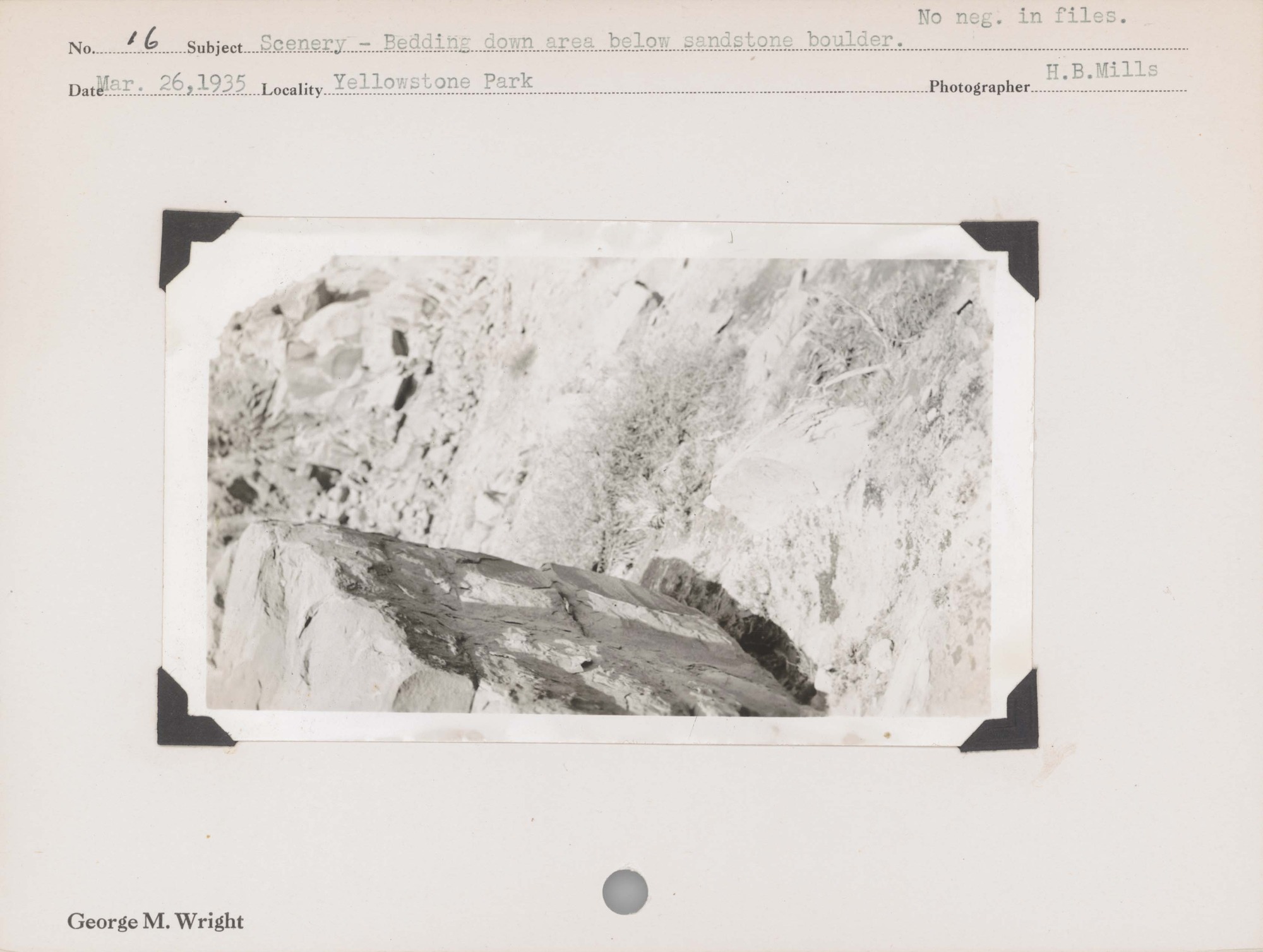 Scenery: Bedding down area below sandstone boulder. No negative on File. Location: Yellowstone National Park, Wyoming.
