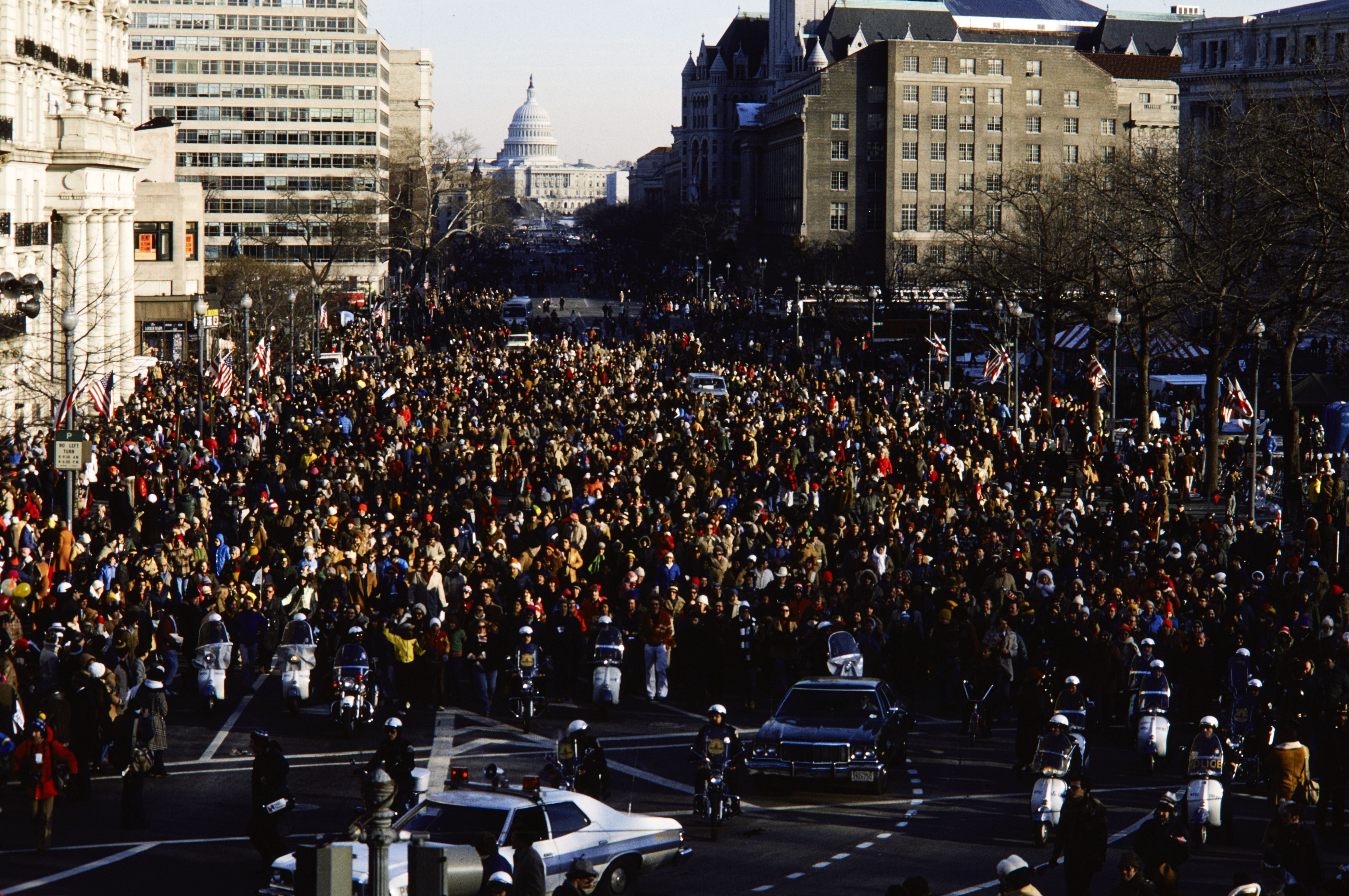 View of the end of President Jimmy Carter's Inaugural Parade with cars, moped mounted police, and civilians flooding onto Pennsylvania Ave. in Washington, D.C.
