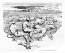 Artist's interpretation depicts four dismounted cavalrymen (troopers) from the Reno-Benteen commands taking a defensive position behind their dead mounts (horses) on the high bluffs above the Little Bighorn River