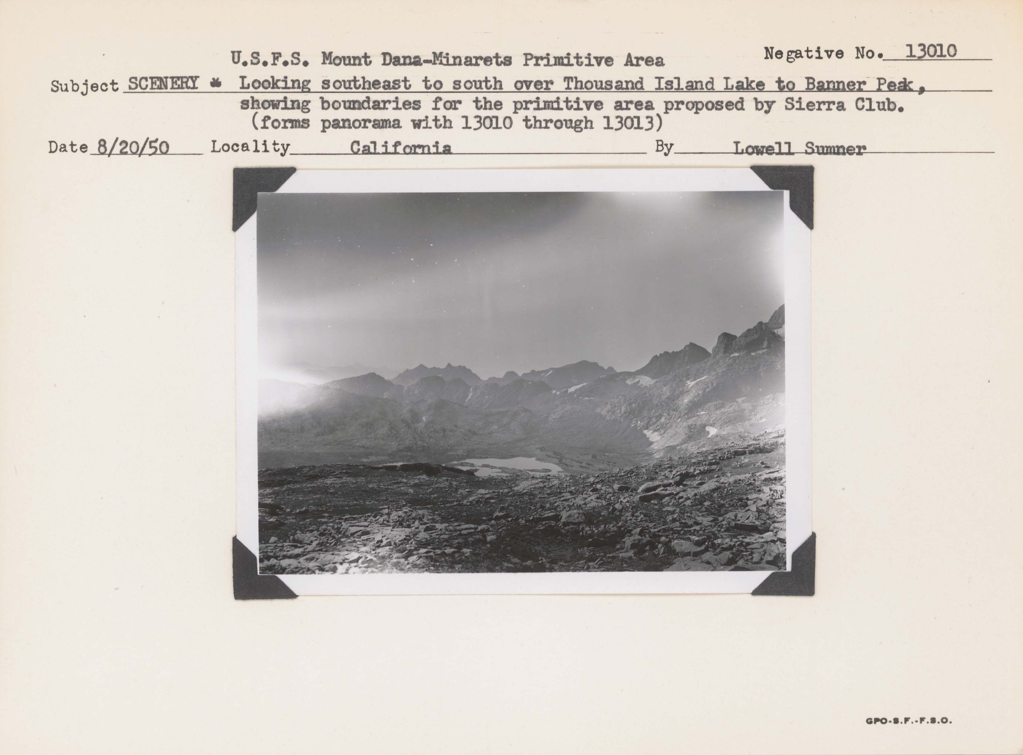Scenery – United States Forest Service Mount Dana -Minarets Primitive Area. Looking southeast to south over Thousand Island Lake to Banner Peak, showing boundaries for the primitive area proposed by Sierra Club. (forms panorama with 13011 through 13013). Negative #: 13010 [13011?]. Locality: California.