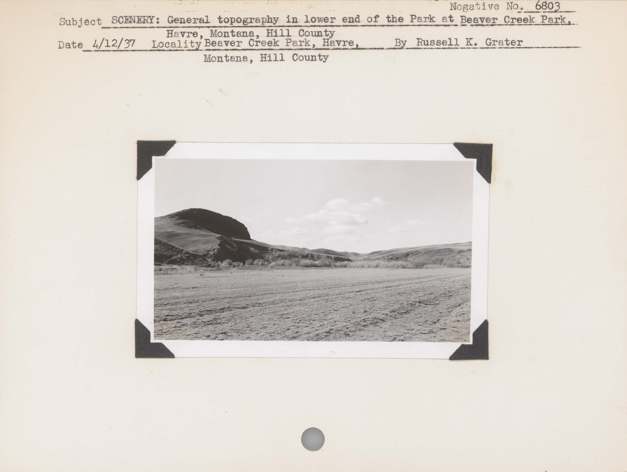 Scenery: General topography in lower end of the Park at Beaver Creek Park, Hill County, Montana. Negative number: 6803. Locality: Beaver Creek Park, Havre, Hill County, Montana.