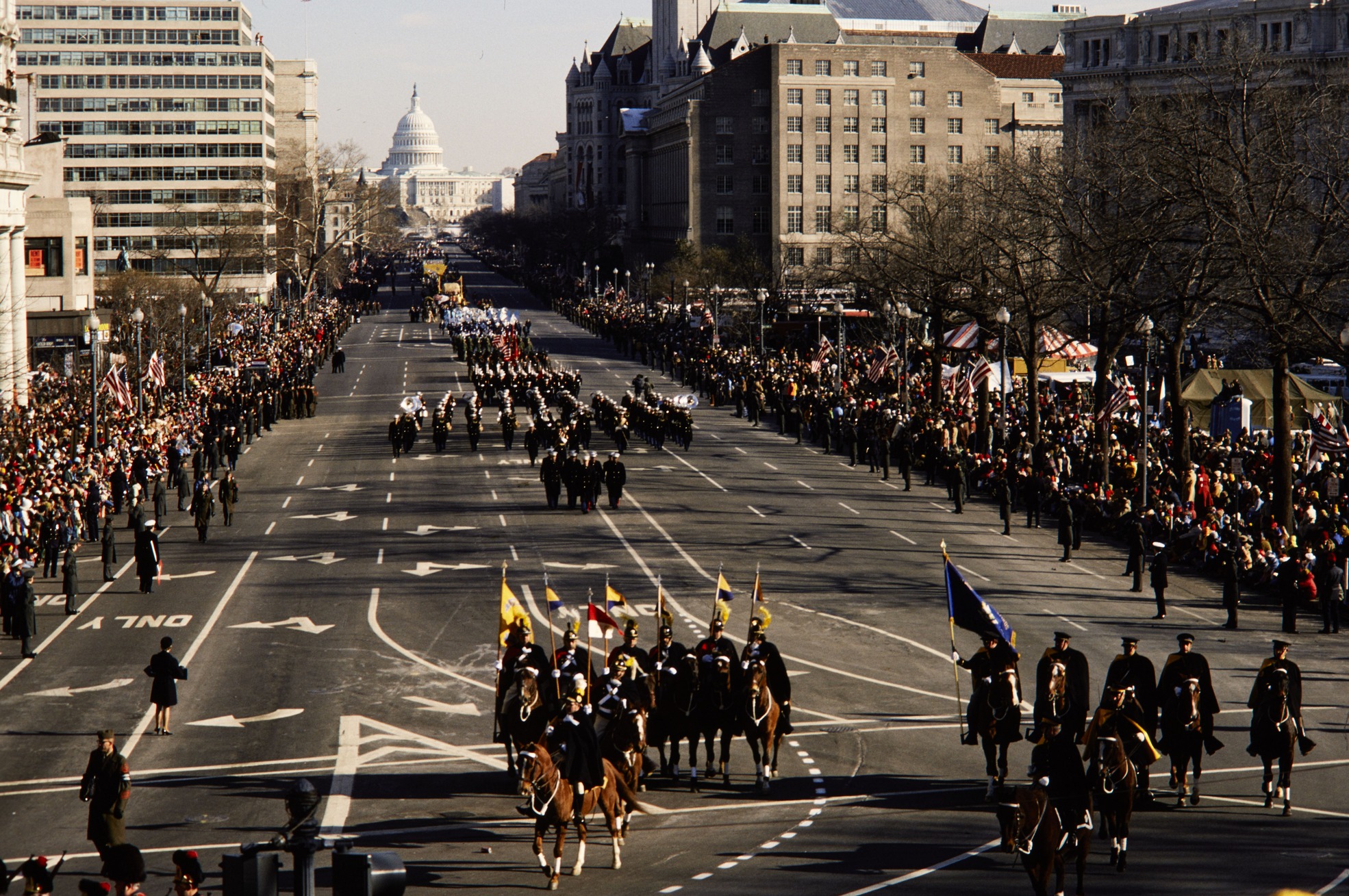 President Jimmy Carter's Inaugural Parade with a cavalry riding past on Pennsylvania Ave. in Washington, D.C.