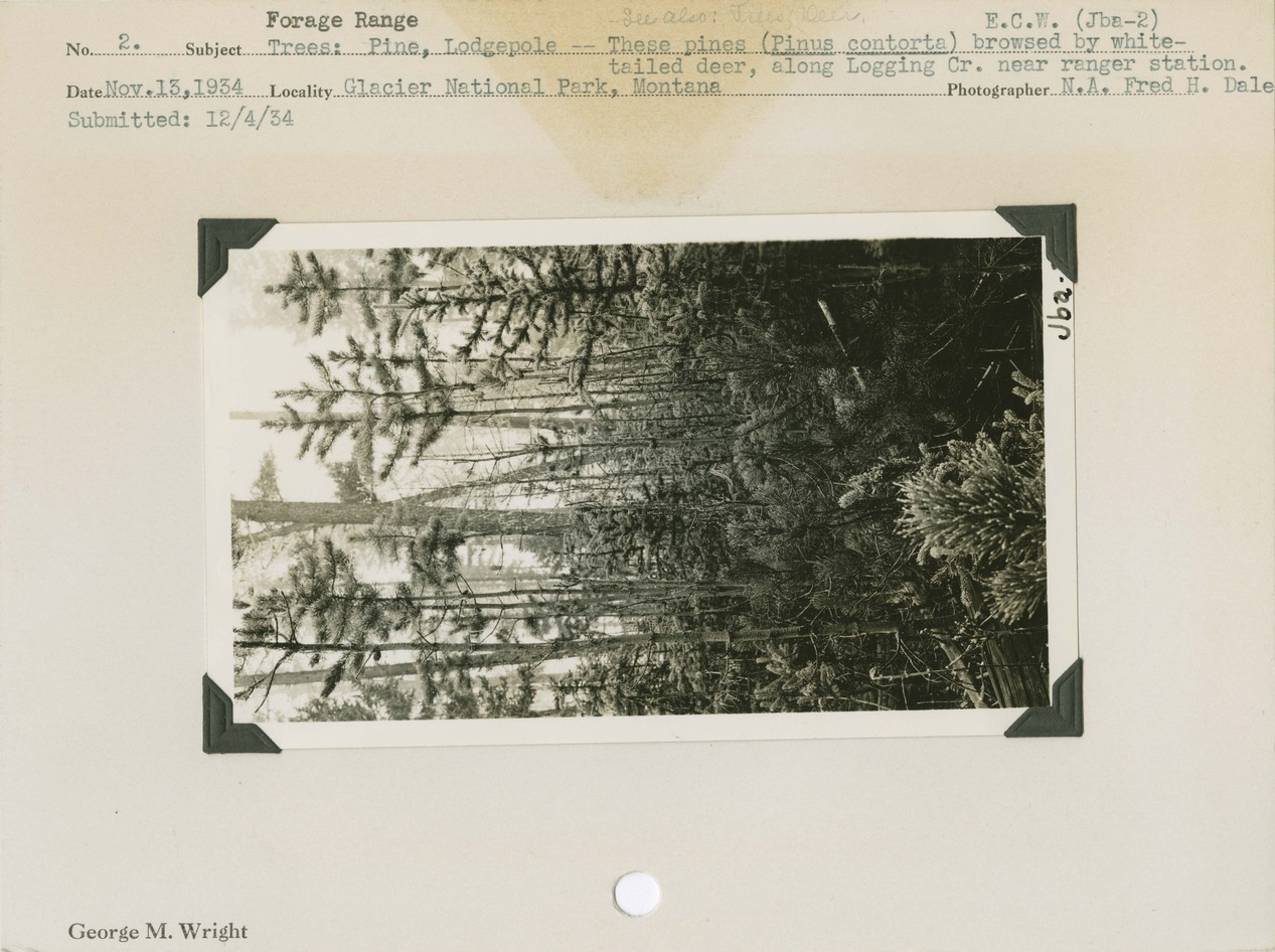 Forage Range. Trees: Pine, Lodgepole -- These pines (Pinus contorta) browsed by white-tailed deer, along Logging Creek near ranger station. Locality: Glacier National Park, Montana. Negative #: ecwjba2. [Photo card also has a "Submitted" date of 12-04-1934]
