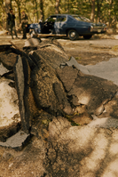 Road damaged by flood at Platt National Park, now Chickasaw National Recreation Area. National Park Service personnel stand in the background next to a blue car.