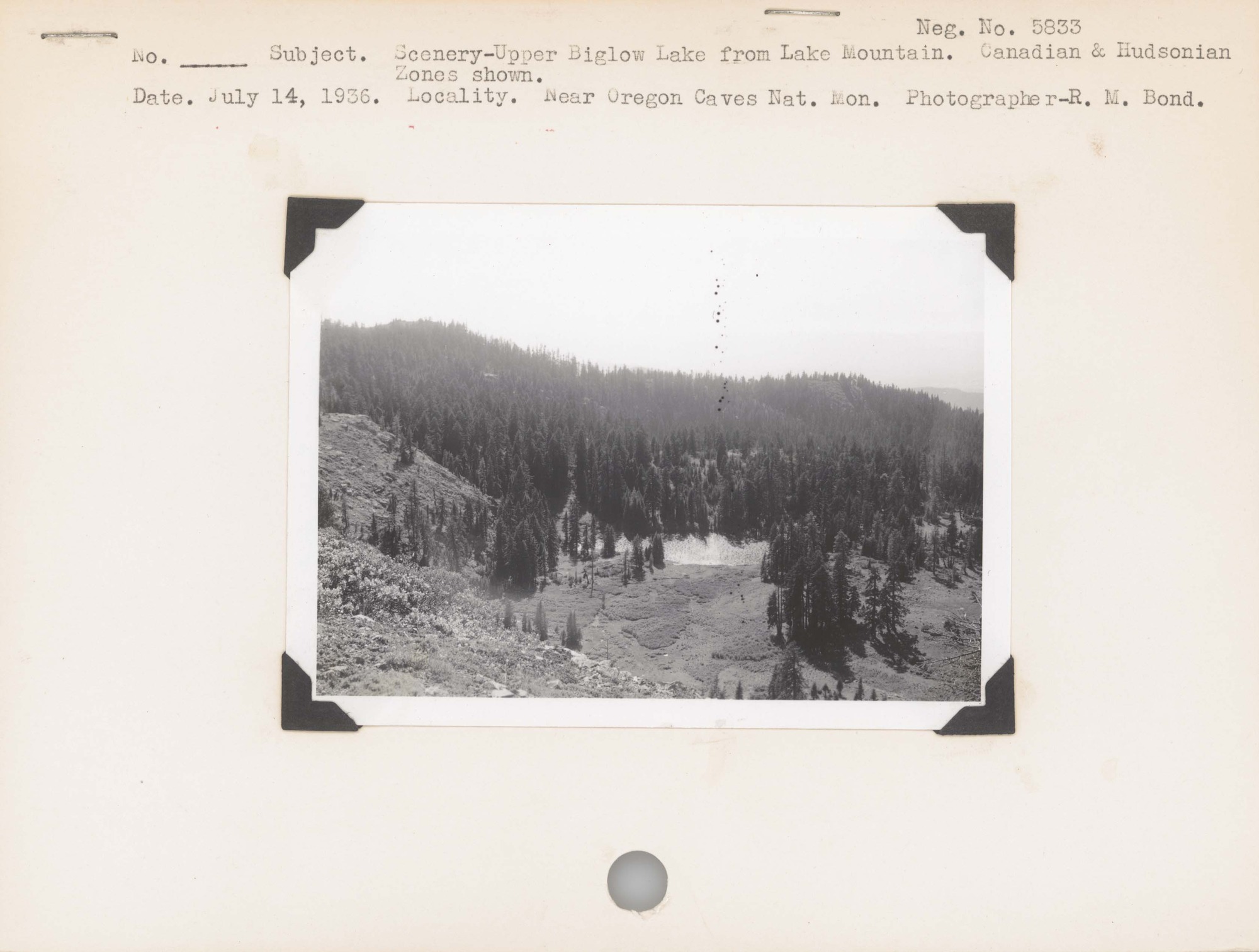 Scenery – Upper Bigelow Lake from Lake Mountain. Canadian and Hudsonian Zones shown. Negative#: 5833. Location: Near Oregon Caves National Monument (Oregon).
