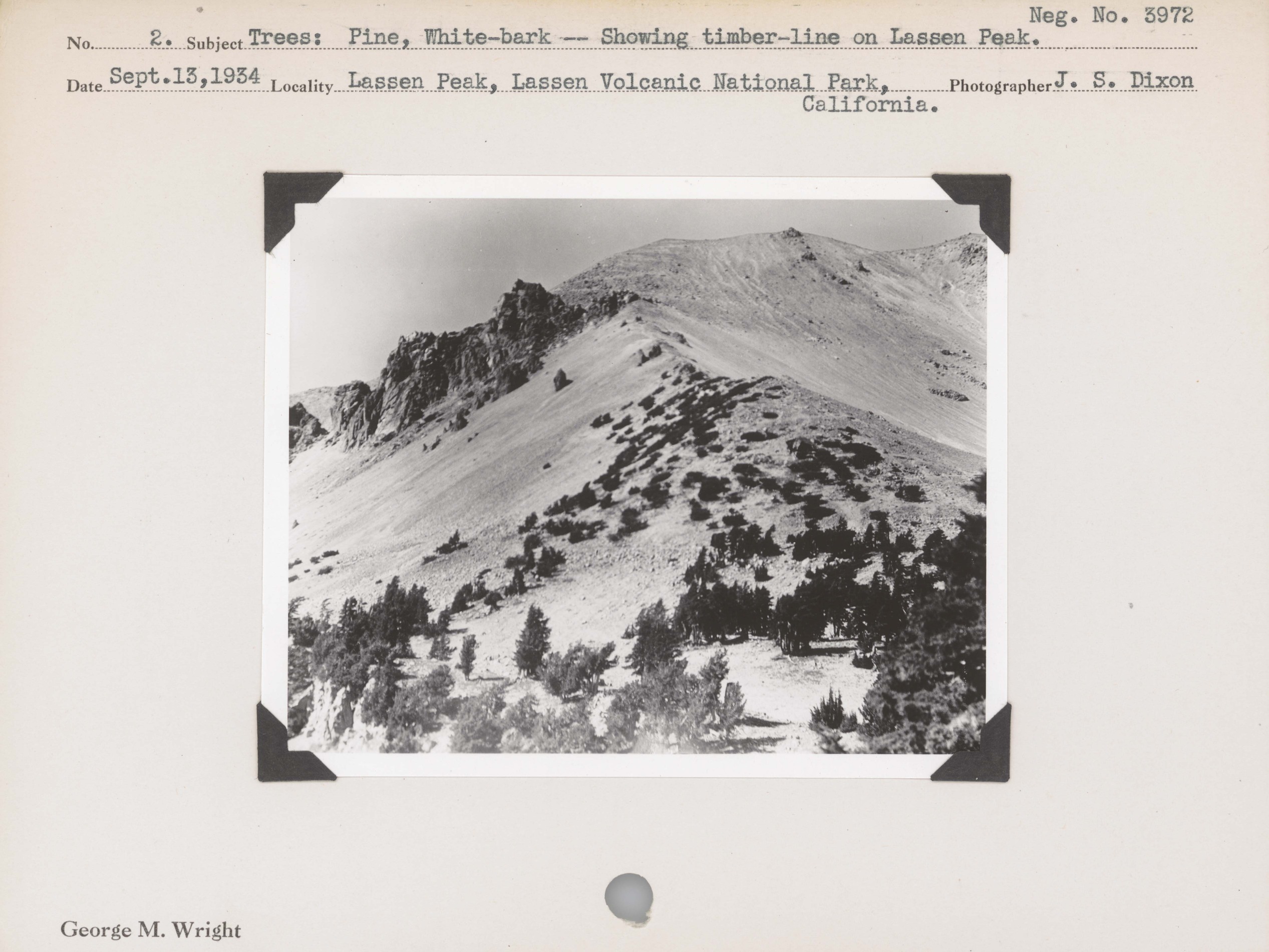 Trees: Pine, White-bark – Showing timberline on Lassen Peak. Negative #: 3972. Locality: Lassen Peak, Lassen Volcanic National Park, California.