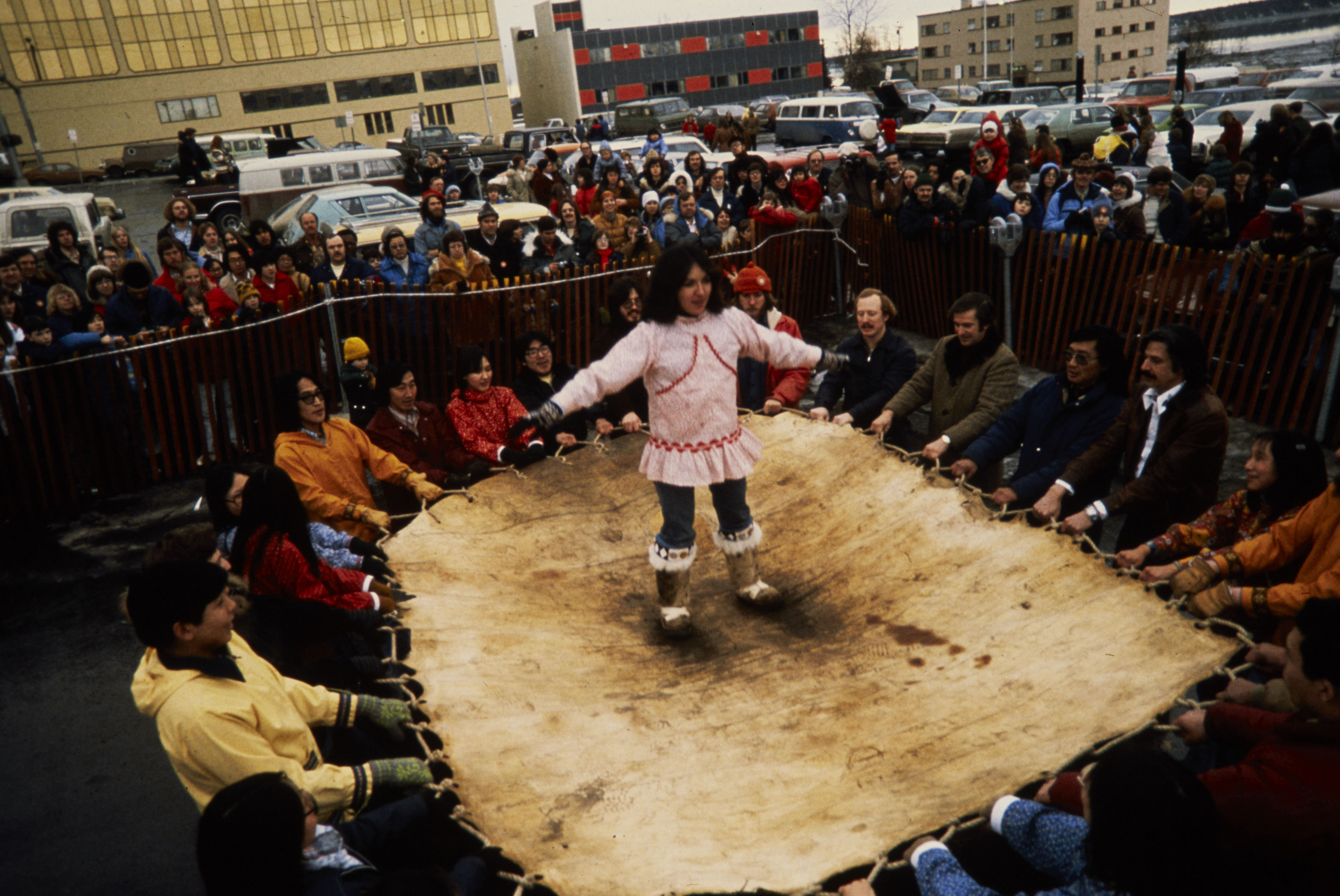 Alaska Natives. Woman participating in a traditional blanket toss, or "Nulukataq," while surrounded by onlookers in the Alaska Region.