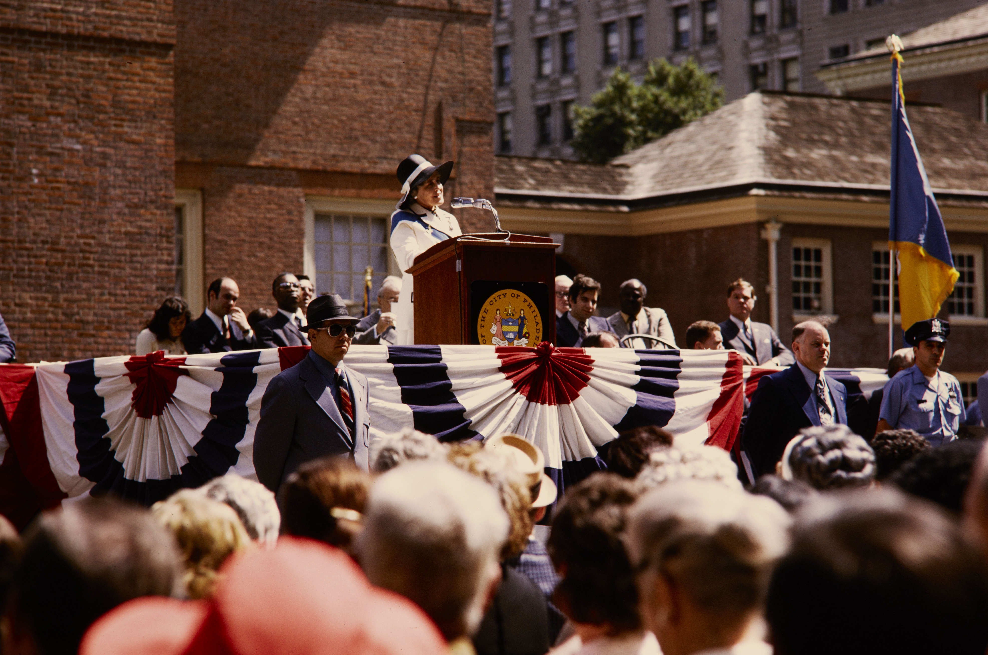 Mrs. Donald Spicer talking into a microphone on a stage at Independence National Historical Park.
