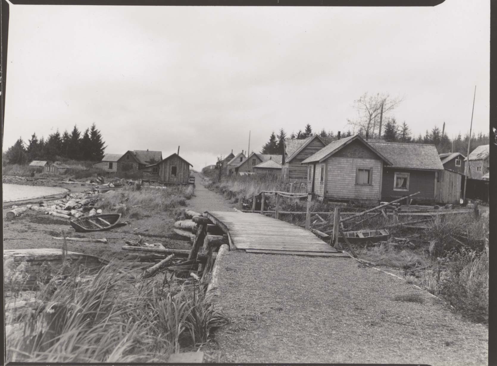 Main street of Village of New Kasaan. Barber shop is first building on left. Negative#: 10749. Location: New Kasaan, Alaska. Location of negative: Wildlife Division, Director’s Office. [This information comes from the reverse of the envelope for this negative number.].