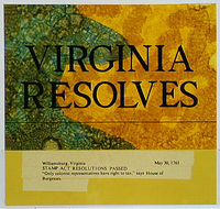 Headlines from May 30, 1765, Williamsburg, Virginia: "VIRGINIA RESOLVES;" "Stamp Act Resolutions Passed;" "Only colonist representatives have right to tax," says House of Burgesses.