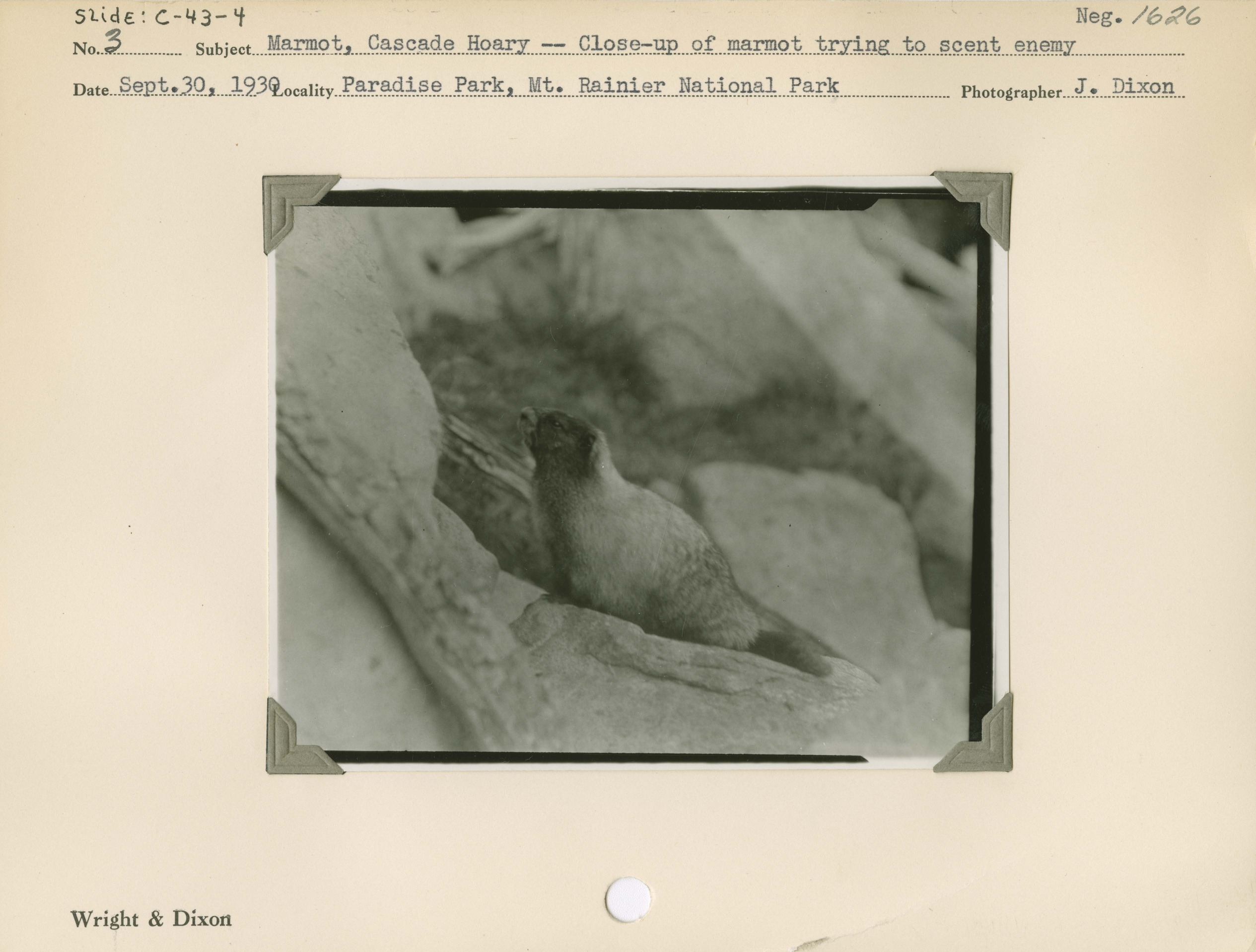 Marmot, Cascade Hoary – Close-up of marmot trying to scent enemy. Negative #: 1626. Locality: Paradise Park, Mount Rainier National Park.