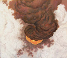 The illustration represents an aerial view of an eruption of a relatively minor vent, looking straight downward into the vent The eruption is of both dust (the rising black column) and of steam (the white clouds) The black specks throughout the illustration represent sparse particles of dust, ash and volcanic hailstones, seen close up