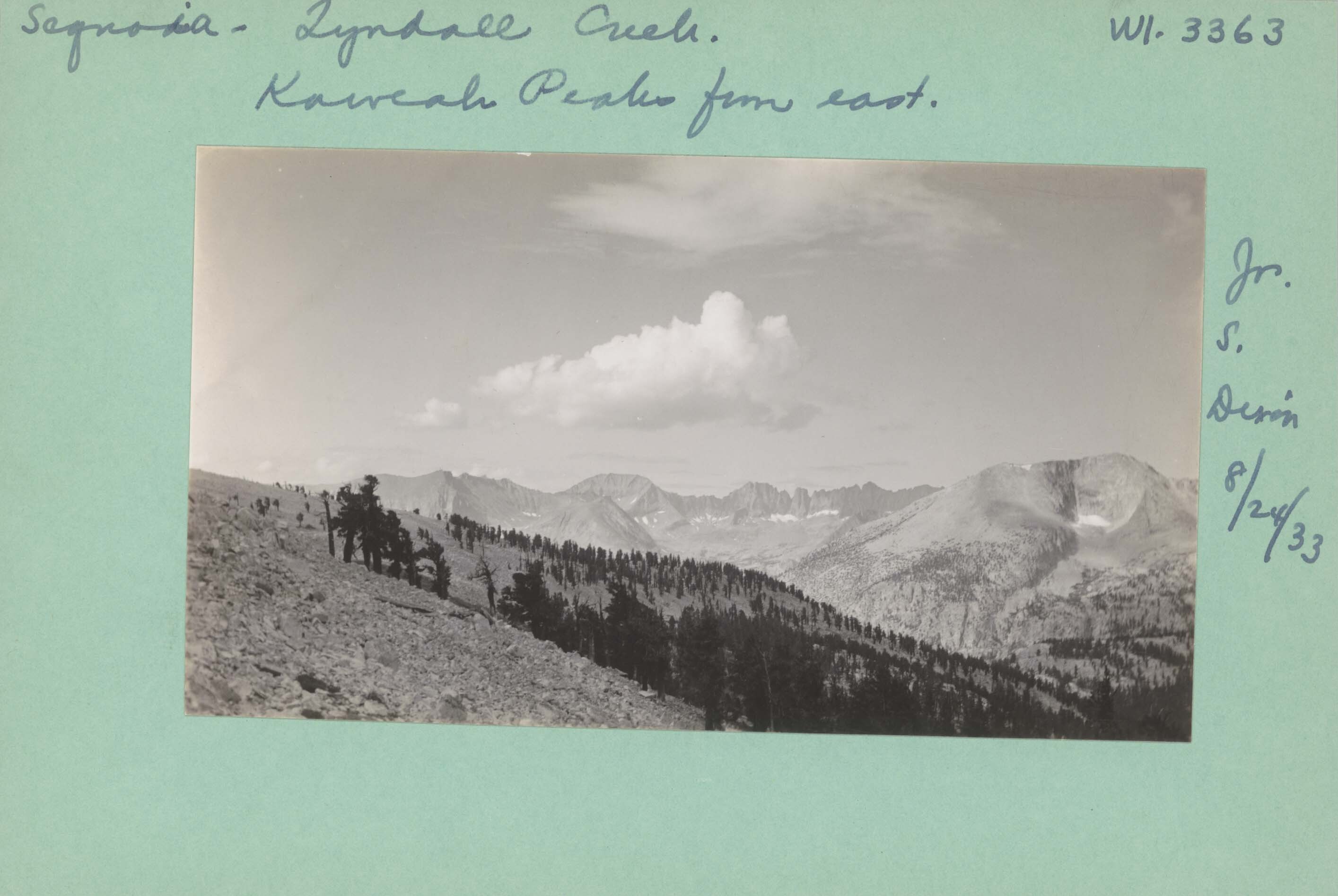 Kaweah Peaks from east. Negative#: 3263. Location: Lyndall (?) Creek -- Sequoia National Park.